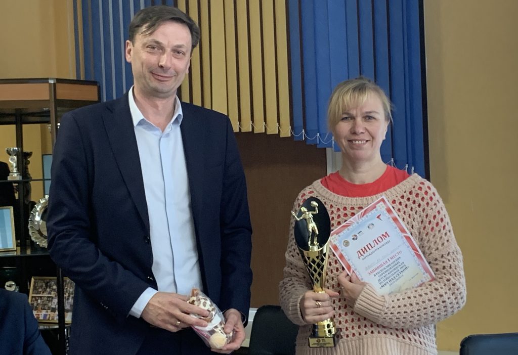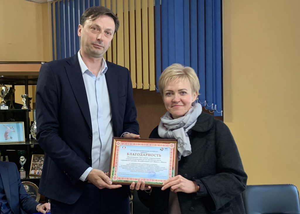Приятной неожиданностью для всех присутствующих стала еще одна награда. Специальным благодарственным дипломом БФВ отметила эффективную работу СДЮШОР Волейбольного клуба «Минск» и вклад, который внес педагогический коллектив нашей школы в воспитание будущих спортсменов. Председатель БФВ Эдуард Венский вручил почетную благодарность директору СДЮШОР Шевченко Оксане Владимировне.