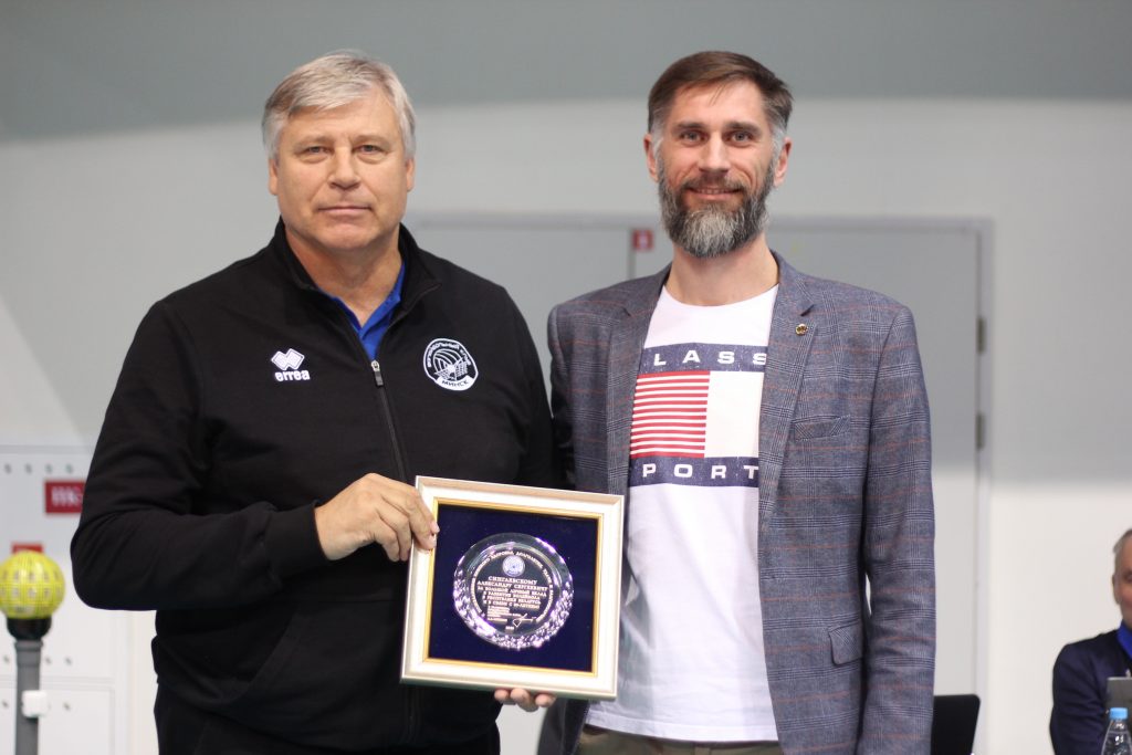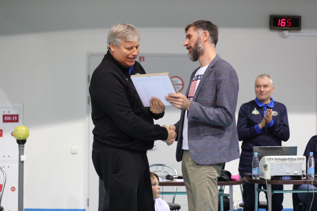 Сегодня встреча наших мужских команд началась с поздравления. По случаю 60-летнего юбилея главный тренер «Строителя» Александр Сингаевский был награжден специальной наградой за значительный вклад в развитие столичного волейбола. Награду Александру Сергеевичу вручил заместитель председателя Волейбольного клуба «Минск» Сергей Рускевич.