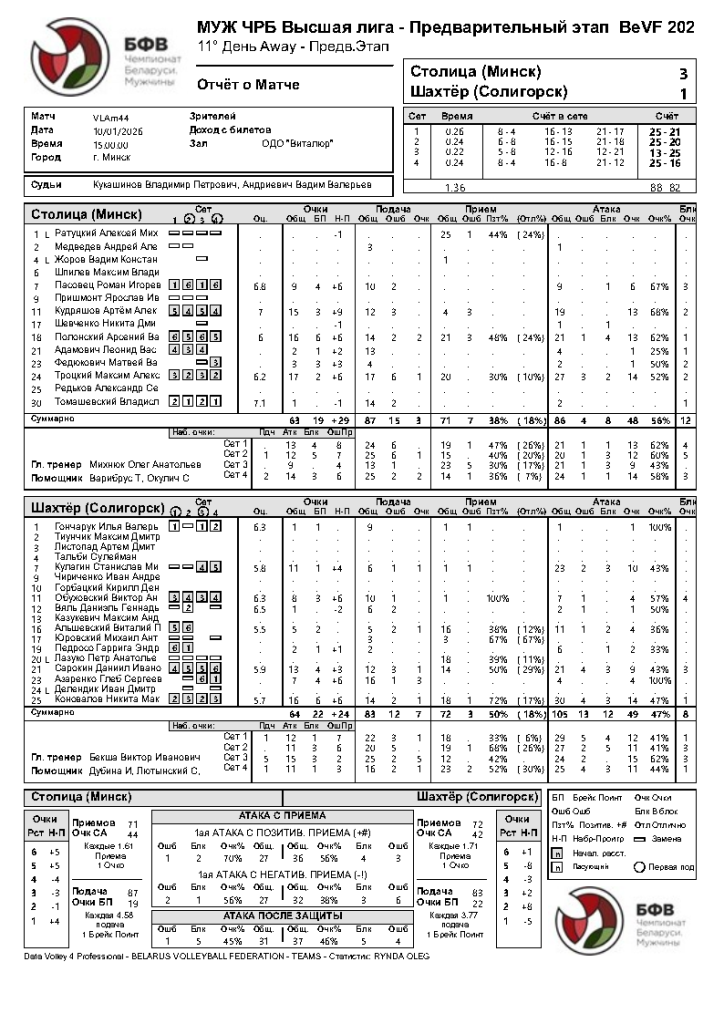 В противостоянии принципиальных соперников хозяева площадки одержали долгожданную победу. Осечка вышла лишь в 3ей партии, когда «Шахтер» нашел свою подачу и удачно задействовал нападающих в атаке. 4ая партия вернула преимущество подопечным Олега Михнюка – как в эмоциональном плане, так и в количестве набираемых очков. Самыми результативными игроками нашей команды стали Максим Троцкий, набравший 17 очков (из них 1 эйс и 2 на блоке), Арсений Полонский – 16 очков (2 эйса, 1 блок), и Артем Кудряшов – 15 очков (2 блока).
