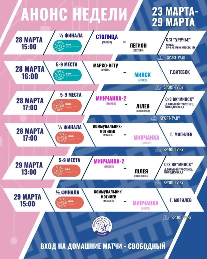 На этих выходных (28-29 марта) девушки дома сыграют с командой «Лілея» из Новополоцка. Нас ждут два зрелищных матча, а в Витебске парни «Минска» встретятся с «Марко-ВГТУ»