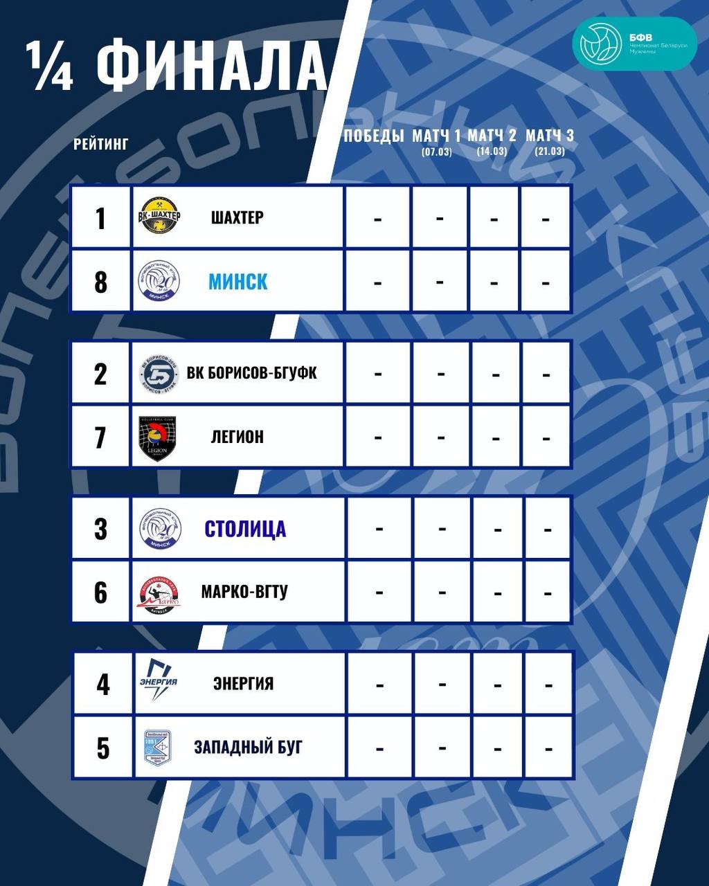 На этих выходных (28-29 марта) девушки дома сыграют с командой «Лілея» из Новополоцка. Нас ждут два зрелищных матча, а в Витебске парни «Минска» встретятся с «Марко-ВГТУ» Регламент женского чемпионата: В этом этапе играют пять команд Высшей лиги, которые завершили предварительный этап на 7-м и 8-м местах или уступили в четвертьфиналах. Ключевые правила: Очки команд не обнуляются