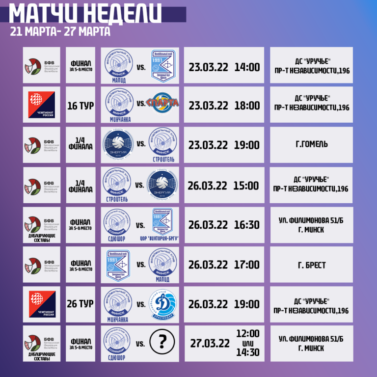 Сегодня состоится первый матч финальной серии Чемпионата Беларуси среди мужских команд. За титул сразятся команды «Строитель» (Минск) и «Шахтер» (Солигорск). За всю историю Минского клуба, команды встречались 98 раз, из которых 66 побед забрал «Строитель». В сезоне 2021/2022 команды сыграли 5 матчей, в 3х из которых победили столичные парни. За 5 встреч больше всего очков